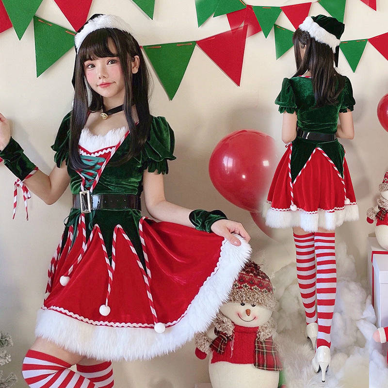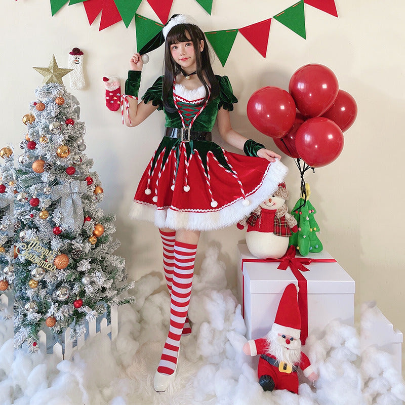 이 축제 엘프 앙상블로 반짝반짝 빛나세요! 벨벳 그린과 레드, 폭신한 화이트 트림, 그리고 캔디 스트라이프 포인트가 어떤 홀리데이 파티든 빛내줄 거예요. 이번 시즌의 마법이 되어 보세요!