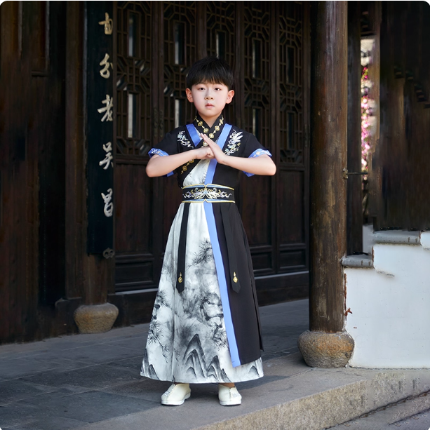 This boys' Hanfu set combines a striking black jacket with sky-blue accents and gold dragon embroidery, paired with a flowing skirt featuring an artistic mountain-and-pine ink wash print. The bold contrast and traditional motifs create a powerful yet elegant look, perfect for cultural events and celebrations. It embodies heritage with timeless style.