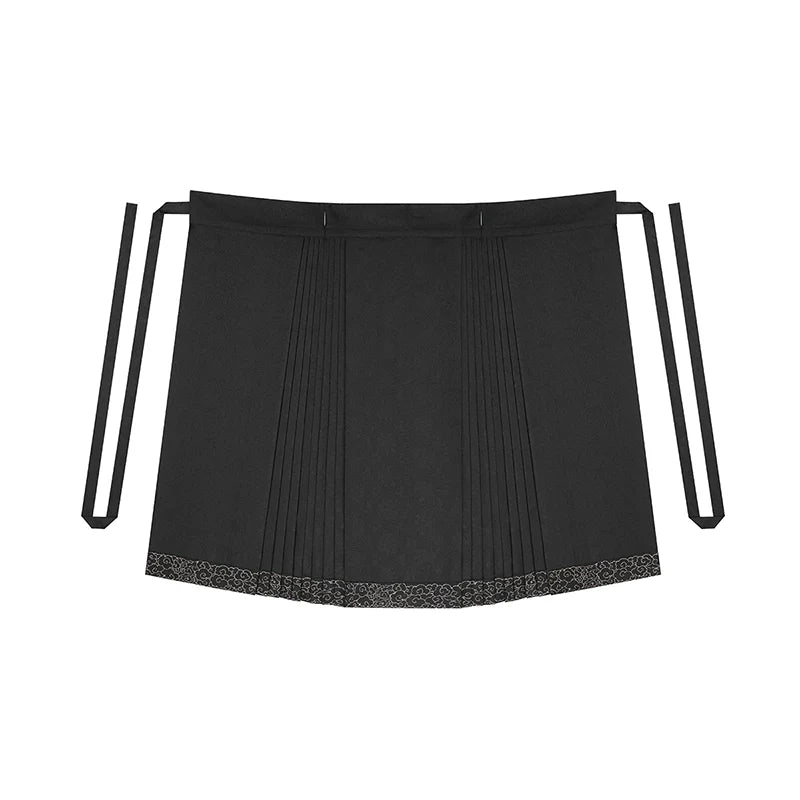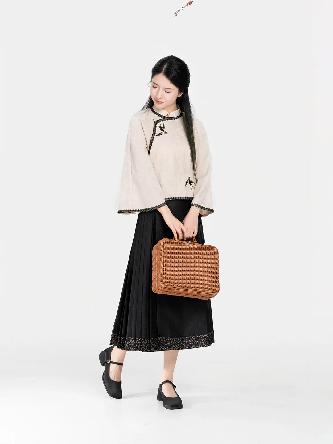 Elegant Hanfu blending tradition with modernity. Features cream top with black piping and bird embroidery, paired with a high-waisted pleated black skirt with lace trim. Perfect for sophisticated, culturally rich occasions.