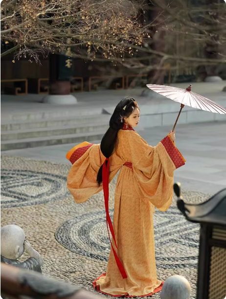 This exquisite zhiju robe captivates with its vibrant golden-yellow silk and bold crimson lapel accents, embodying regal elegance. The flowing straight-cut silhouette and intricate sash detailing highlight traditional craftsmanship, while the luxurious fabric ensures graceful movement. Perfect for cultural events, it merges historical prestige with timeless sophistication.
