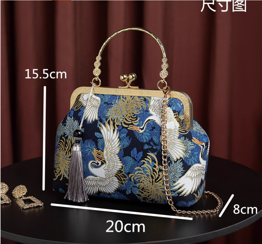 This deep blue clutch showcases exquisite Oriental artistry with gold-embroidered chrysanthemums and white cranes, symbolizing longevity and nobility. The vintage-inspired metal frame, dual gold-chain handles, and detachable grey tassel blend tradition with modern functionality.